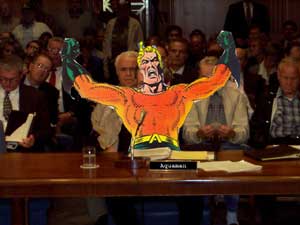 Today on Capitol hill Aquaman appeared before a house sub-committee investigating the failures surrounding the insufficient response to hurricane Katrina, specifically action related to the greater New Orleans Metropolitan area. As cleanup efforts are still under way in Louisiana and Mississippi, the American public is searching for answers among the destruction. The heir to atlantis maintaining his innocence with the direct alibi of tending to "matters of the sea" faced a salvo of questions regarding chain of command, responsibility and reaction in times of crisis. Sen. Mcleary assuaged that the alleged failures came in part due to flagging popularity of the super hero which has developed into an increasing disregard for land dwellers which is in fact a gross failure of duty. Aquaman briefly lost his composure when Sen. Alstott produced a document that appears to equate that Aqualad was responsible for that portion of the hemisphere, and went on to ask if their recent falling out over the "tempest-gate" naming fiasco had anything to do with poor leadership. With Aqualad (tempest) conspicuously absent, the Water bearer had cited his own lack of action until four days after the disaster was in part to his physical distance to the disturbance. The new base of operations is equidistant to all points along the pacific rim, making it difficult to respond to the major crises of other oceans. Sen. Mcleary aired the notion that Aquaman would not have helped immediately regardless of distance, and cited the Tsunami that affected many Southern Asian countries as direct evidence because of its relatively close range to the said base of operations. A UN formed council is still under investigation of the failures of the Tsunami to which Aquaman is connected but under strict order not to comment. After the hearing Aquaman declined to speak to the press, and proceeded to the Potomac river where a chauffeured Seahorse awaited him. He could face a JLA court martial and up to 8 years in the phantom zone. |